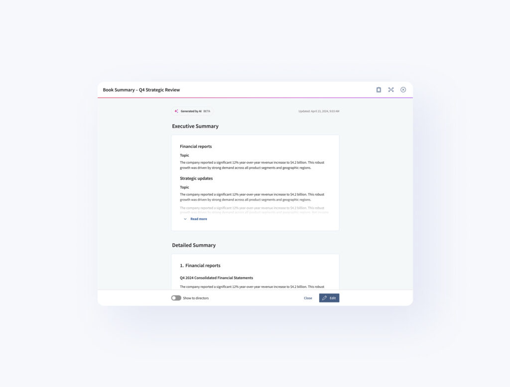 Help your directors and executives prepare for every board and committee meeting with summaries featuring: AI powered book summarization simplifies board books into concise, actionable insights with a single click.​