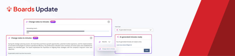 Relevant, high-quality meeting minutes with actions built from board materials, typed notes or transcripts. ​ Draft minutes and track actions instantly​ Ensure you get the most from your minutes with the ability to:​ Generate the first draft board and committee meeting minutes based on board book documents​ Rewrite notes into meeting minutes​ Articulate key takeaways​